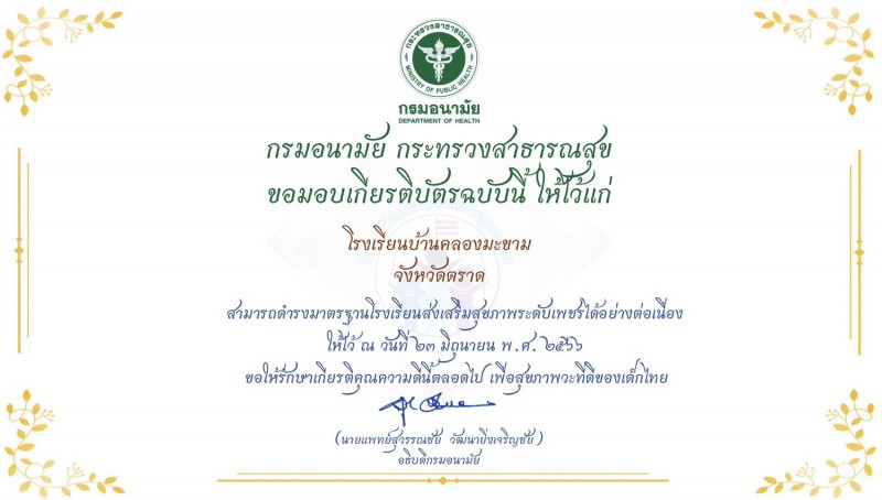โรงเรียนบ้านคลองมะขามเข้ารับรางวัลโรงเรียนส่งเสริมสุขภาพระดับเพชรได้อย่างต่อเนื่อง จากนายแพทย์สุวรรณชัย วัฒนายิ่งเจริญชัย อธิบดีกรมอนามัย กระทรวงสาธารณสุข ในพิธีปิดการประชุมวิชาการส่งเสริมสุขภาพและอนามัยสิ่งแวดล้อมแห่งชาติ ครั้งที่ 16 พ.ศ. 2566 “เมือง พลเมือง อัจฉริยะ : Smart City Smart Citizen” เมื่อวันที่ 23 มิถุนายน 2566 ณ โรงแรมอัศวิน แกรนด์ คอนเวนชั่น |