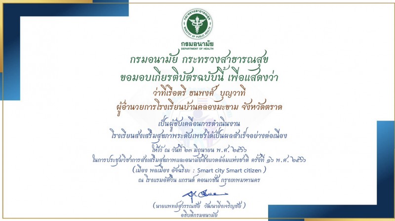 รางวัลโรงเรียนส่งเสริมสุขภาพระดับเพชรได้อย่างต่อเนื่อง