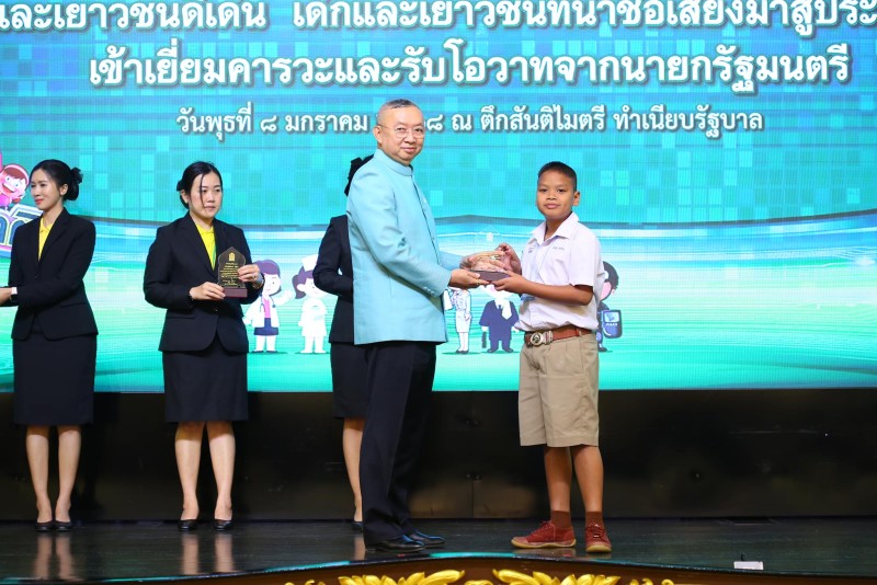 เด็กชายศราวิน ไกรเรือง นักเรียนชั้นประถมศึกษาปีที่ 5 รับโล่เกียรติคุณ เด็กและเยาวชนดีเด่น จาก รัฐมนตรีว่าการกระทรวงศึกษาธิการ เนื่องในวันเด็กแห่งชาติ ประจำปี 2568